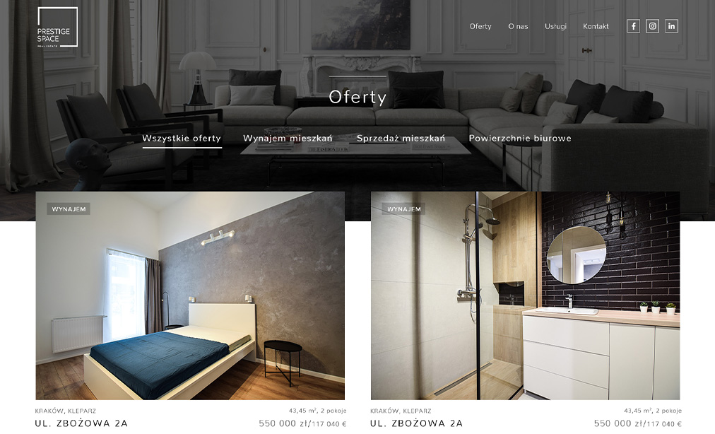 Strona internetowa wraz z wbudowanym systemem CRM dla biura nieruchomości, specjalizujący się w sprzedaży oraz wynajmie mieszkań i lokali biurowych.