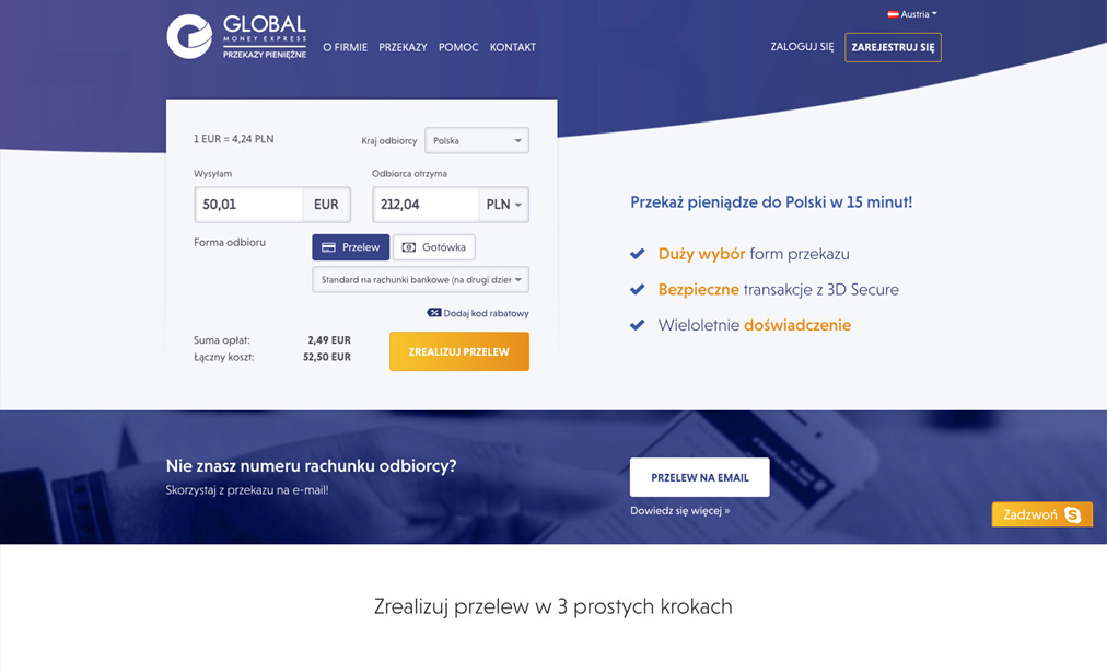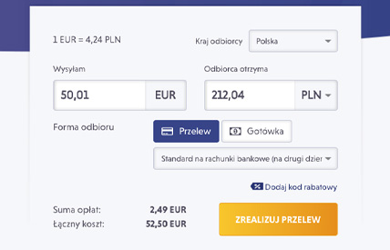 Klienci serwisu mają możliwość wygodnego przeliczenia walut oraz wybierania dostępnych sposobów przekazu, kontrolując na bieżąco koszt przekazu oraz czas jego realizacji.