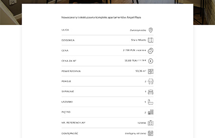Oferta przedstawiona jest w sposób estetyczny. Do każdej oferty dodane są szczegóły dotyczące lokalizacji, ceny, powierzchni oraz inne informacje niezbędne do szczegółowej prezentacji oferty.