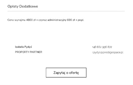 Piękno musi łączyć się z użyteczonścią strony - dlatego każda oferta posiada szybki kontakt z agentem oraz informacje o nim, dodatkowo istnieje możliwość korzystania z formualrza zapytania ofertowego.